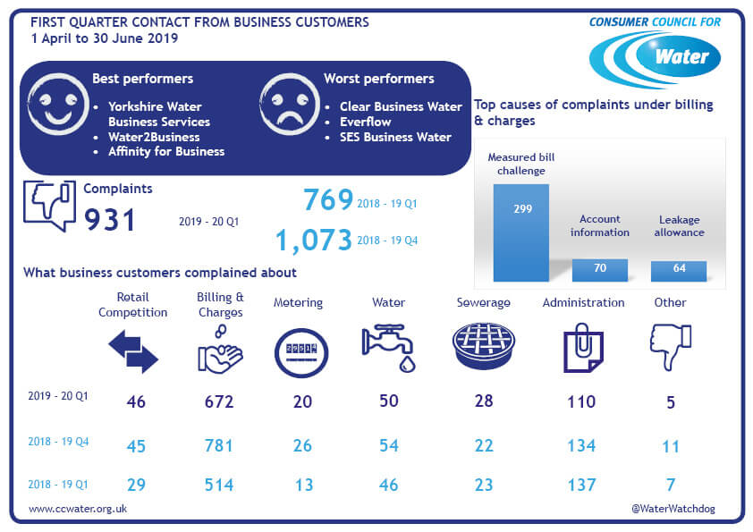 The Consumer Council for Water (CCWater) has revealed that it handled 931 complaints from businesses during the first three months of 2019/20. And while that was marginally fewer than the previous quarter, the consumer body still received 162 more complaints than during the same period last year.